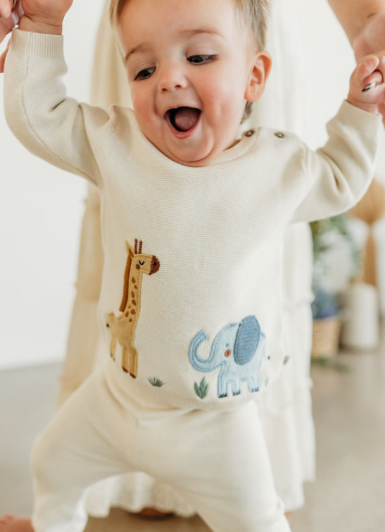 The Safari Animals Baby Pullover Sweater is crafted from 100% organic cotton with playful giraffe and elephant appliqué details that bring extra charm to chilly days. Each friendly face is carefully crafted to delight, perfect for layering or wearing solo.