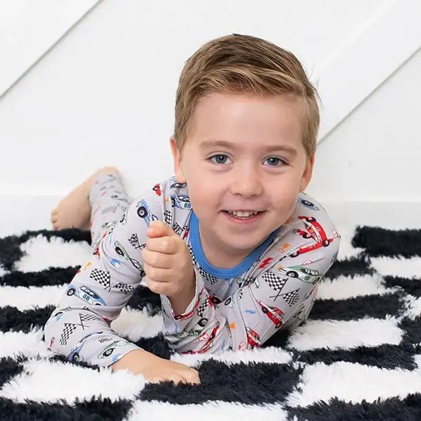 The Car Print Boys Pajama is for big brothers who love leading family racing adventures. Ultra-soft bamboo keeps him comfortable from bedtime through breakfast. Coordinates with baby brother's matching convertible footie.