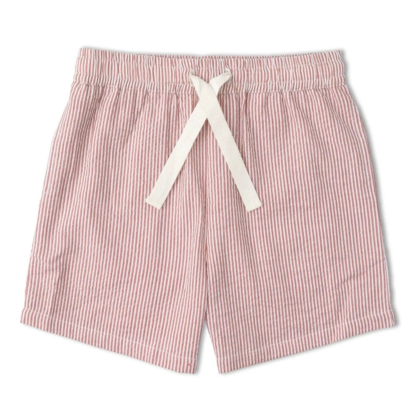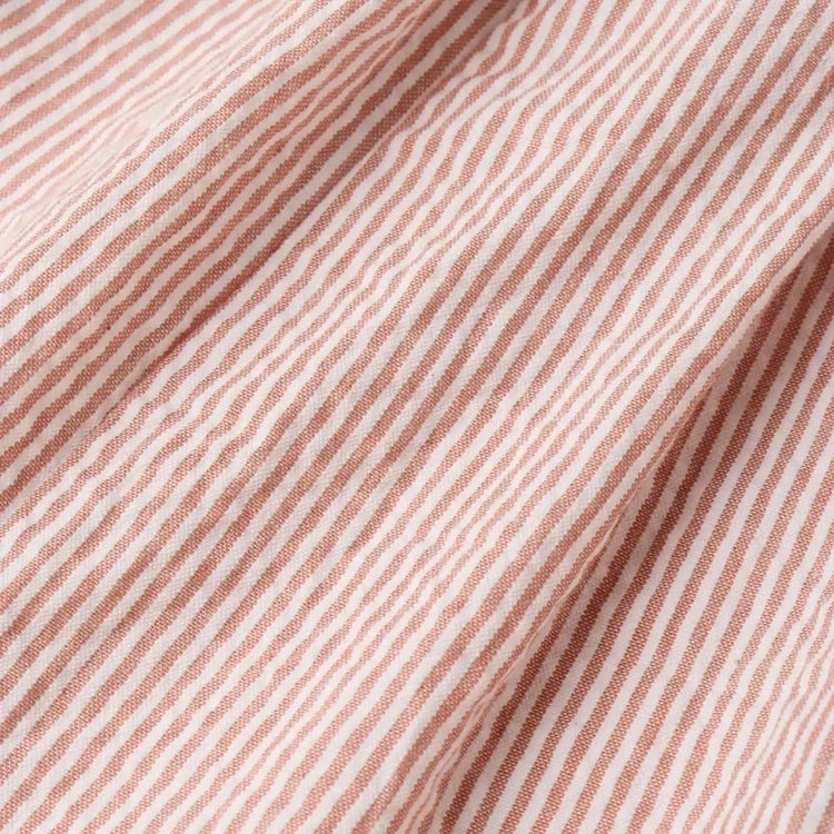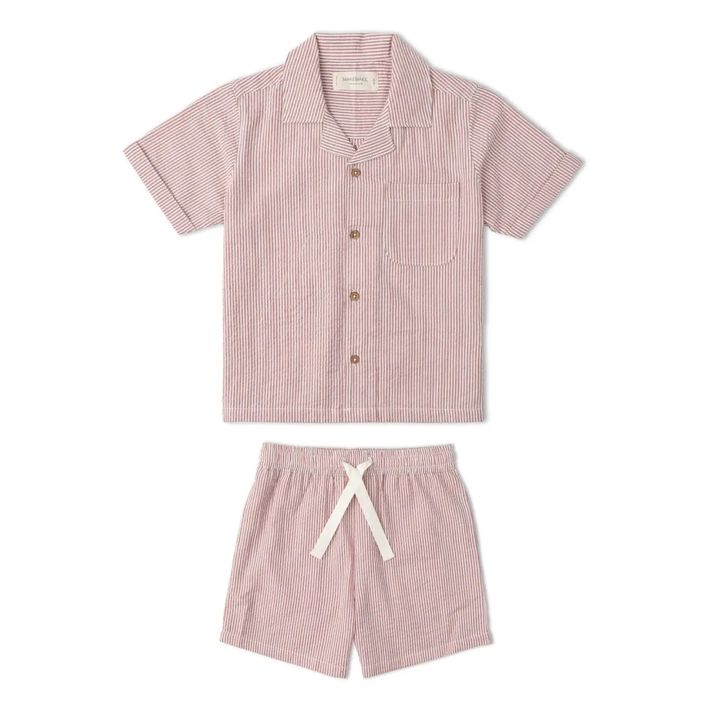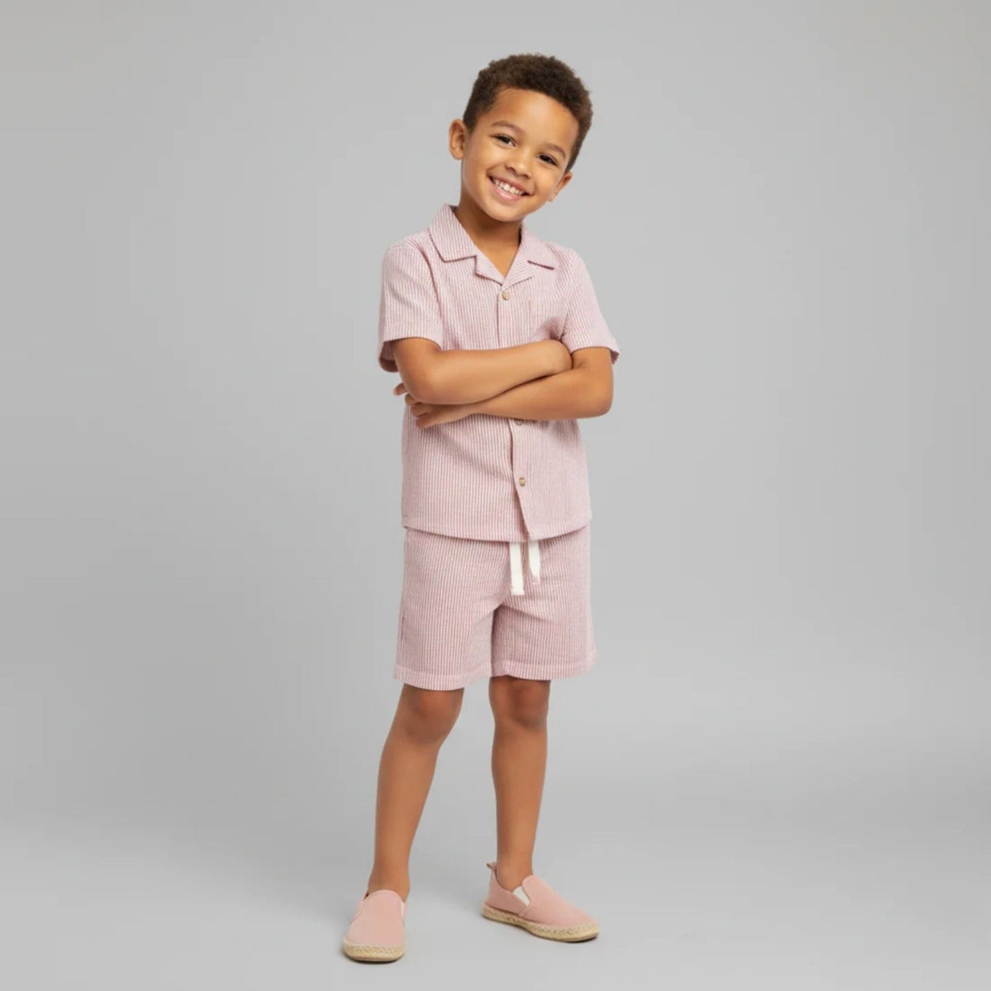 A warm coral stripe in a breezy cotton-linen blend — the kind of set that photographs beautifully and feels even better to wear. The button-up shirt and matching shorts are lightweight and breathable, built for kids who move a lot in the heat. A summer staple they'll grow into season after season.
